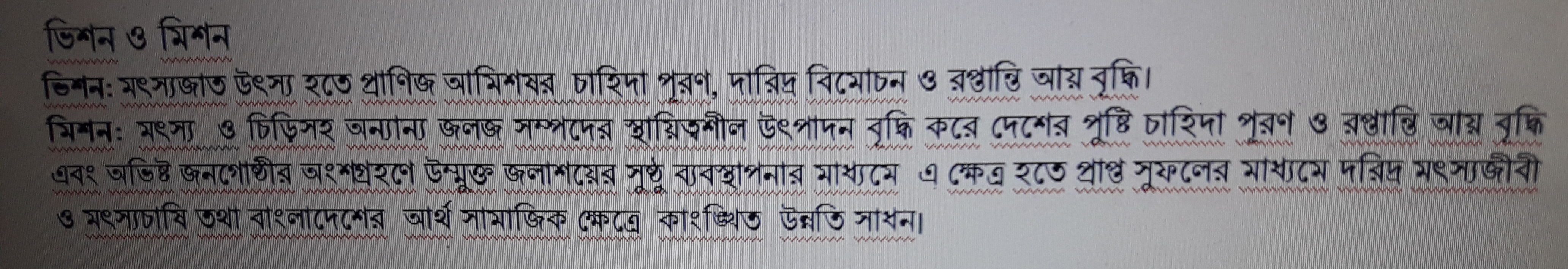 ভিশন: মৎস্যজাত উৎস্য হতে প্রাণিজ আমিশষর চাহিদা পূরণ, দারিদ্র বিমোচন ও রপ্তান্তি আয় বৃদ্ধি।